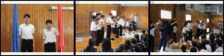 本校体育館にて、体育大会時実行委員を中心に結団式が行われました。今年度は「大繩対決」にて団カラーを決定しました。