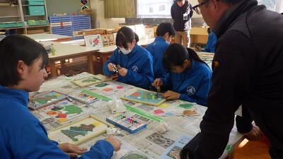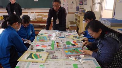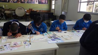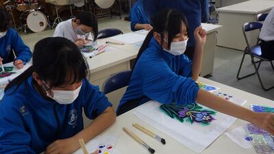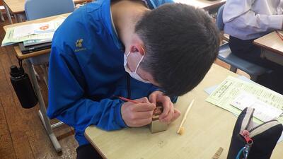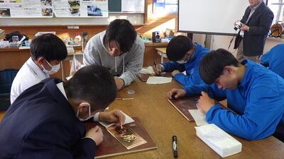 2年生が宮崎県職業能力開発協会の「ものづくりマイスター派遣事業」でマイスターを20名お迎えしてものづくり体験を行いました。板金では銅板に薬品も使って美しい名前を打っていました。洋裁では、リバーシブルのトートバックをきれいに縫い上げていました。印章彫刻では印鑑の種類を知り、自分の名前を彫っていました。染色では自分の選んだ柄に染めてハンカチなどを作っていました。左官では色のついた砂をこてで塗って絵を完成させていました。マイスターの指導や助言で出来上がった作品はどれも素晴らしく、生徒たちは互いに自慢しあっていました。マイスターの皆様、事前の準備と当日のご指導をありがとうございました。