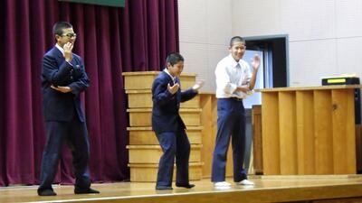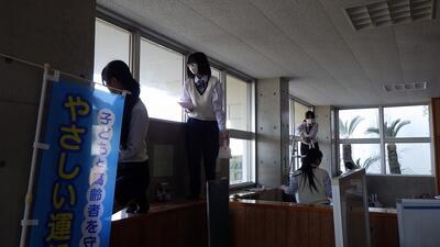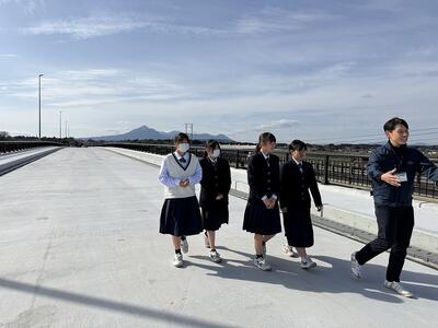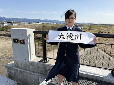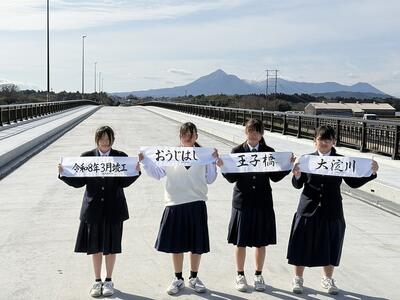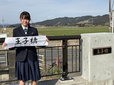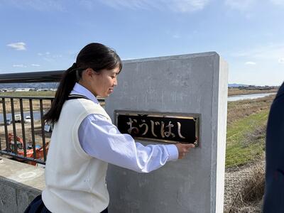 志和池から高城に向かう道の大淀川に架かる新しい橋(王子橋)の銘板を揮毫した生徒たちが、橋に銘板の取り付けをしました。まだ工事の途中でアスファルトが敷かれていない真っ白な橋に、生徒が書いた美しい字の銘板を取り付けると、橋に命が吹き込まれたように感じました。生徒たちは記念にミニチュアの銘板をいただきました。橋は11月に完成の予定だそうです。宮崎県:都城土木事務所の皆様、このような貴重な機会をありがとうございました。