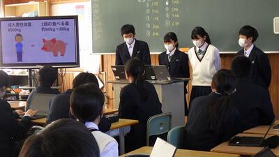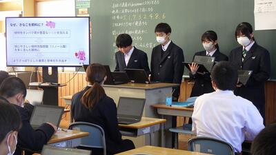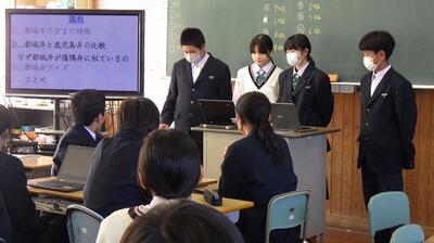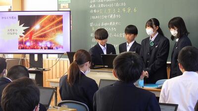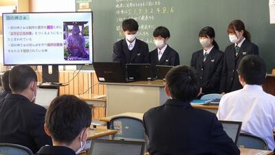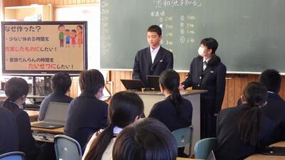 1年生の総合的な学習の時間に「志和池を知る」というテーマで調べたプレゼンの発表を行いました。写真やイラストを入れて分かりやすくしたスライドを表示しながら、興味をひくようクイズや寸劇を織り交ぜて発表していました。どの班も、小学校時のジュニアICTリーダー研修やプレゼンコンテストで培ったプレゼン力が十分に生かされた素晴らしい発表でした。発表後に参観した生徒からの評価やコメントを熱心に見ていました。次の発表に活かせるといいですね。