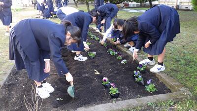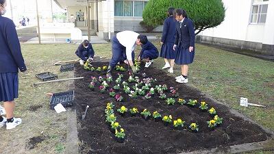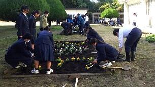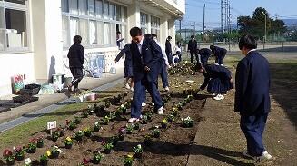 生活美化委員会がパンジーの苗を花壇に植えました。都城農業高校が育てた、黄色や白、赤色のパンジーを、並べて文字を作ったり、色を考えて列を作って植えたりしていました。1学級に70株ほど配付されましたが、学級で協力して昼休みに植え終わることができていました。大きくなってさらに花をつけるのが楽しみですね。
