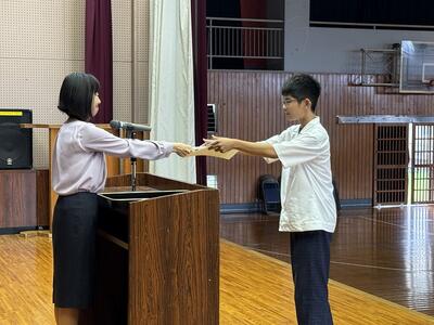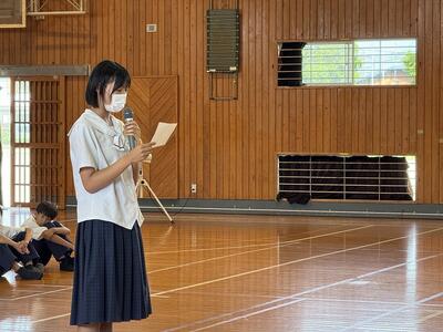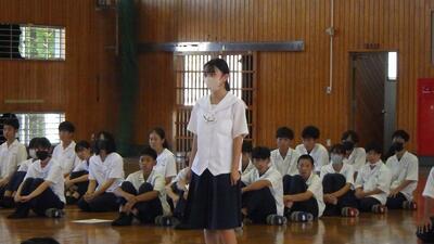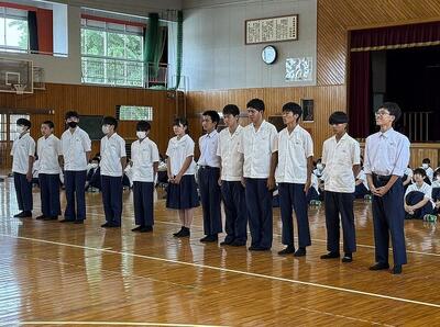 2学期が始まりました。始業式では、県大会テニスシングルスで優勝した2年女子生徒、サッカー、Q-1グランプリで20位以内に入った3学級の表彰をした後、各学年代表による新学期の抱負を発表しました。1年生は、目・耳・心で話を聞き授業に集中すること、2年生は質と量を高めて勉強と部活を両立すること、3年生は決断の時なので今の努力を未来につなげたいと発表しました。校長先生からは、各学年、中学校生活で残された時間は異なるので、自分の時間の使い方を自分で決められる大人になること、これが本当の自立であると話がありました。