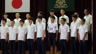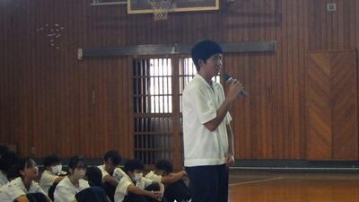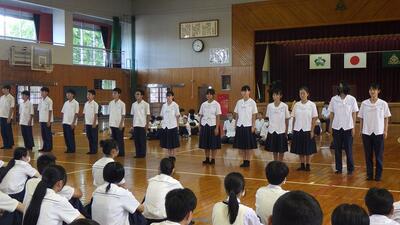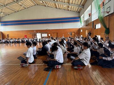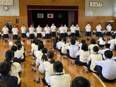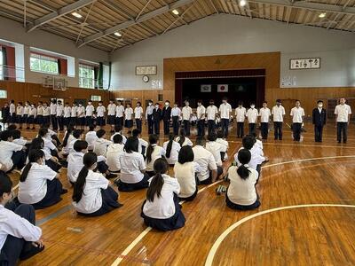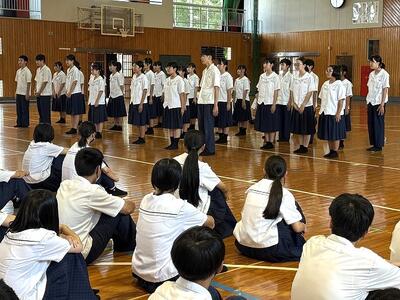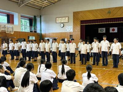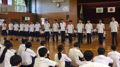 中体連総合体育大会県大会と県吹奏楽コンクールの壮行会が行われました。7月5日から24日まで分散して開催される中総体県大会には陸上とバドミントン、テニスそして相撲が出場します。また、19日から21日に行われる県吹奏楽コンクール中学の部では21日に志和池中は出場します。どの部・クラブも、志和池中代表、そして都城地区の代表として、それぞれ練習したり試合や舞台を経験したりして積み上げてきた力を発揮できるといいですね。