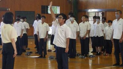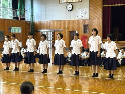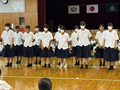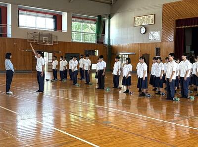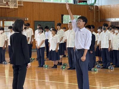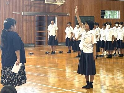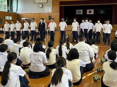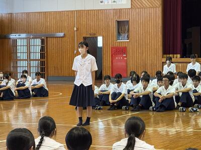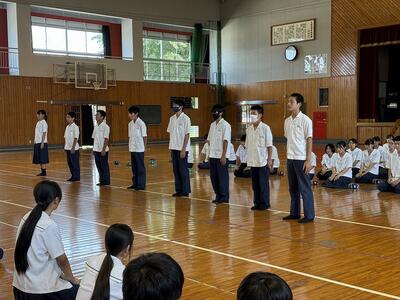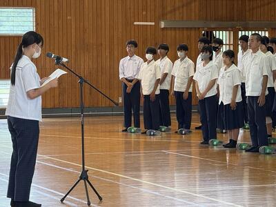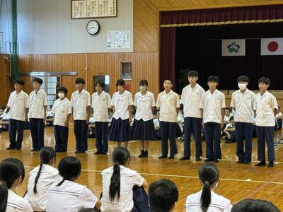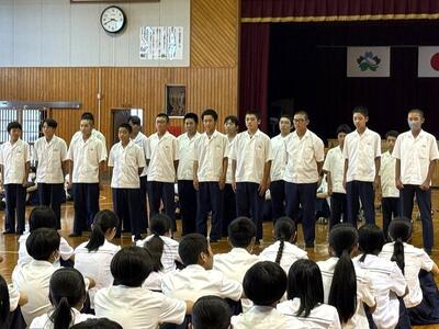 9月20日から10月6日にかけて行われる地区中体連秋季体育大会の選手壮行会が行われました。3年生が引退して初めての壮行会でしたが、2年生のキャプテンが意気込みをしっかりと発表してくれました。選手宣誓では、「私たちにできることを精一杯頑張って発揮してきたい」と自分の想いを大きな声で宣誓してくれました。非常に暑い夏も、突然の大雨でも、練習してきた成果を発揮できるといいですね。