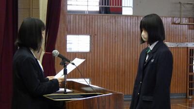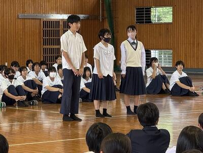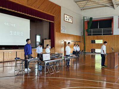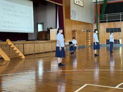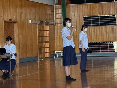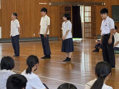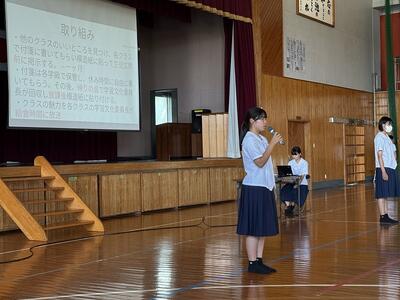 生徒会集会と表彰集会が行われました。生徒会集会では、各委員会の6・7月の目標と取組を発表しました。クラスや友達のよいところを認め合う取組や、熱中症予防、ロッカーの整理など今の課題に対応する取組が盛り込まれており、学校生活を良くしようという生徒会の思いを感じました。また、生徒総会で話し合われたプラバンづくりなどを早速実行していくことが報告されました。表彰集会では、地区総合体育大会を中心に多くの人が表彰されました。