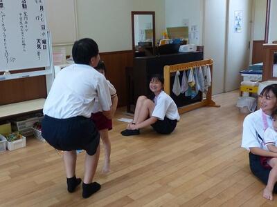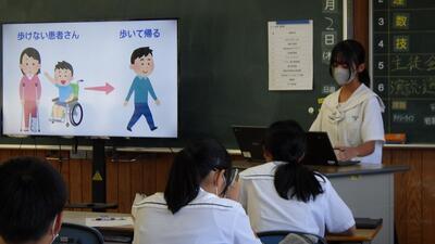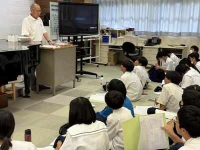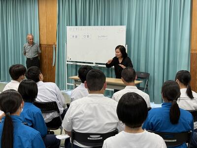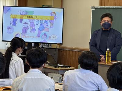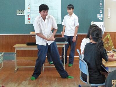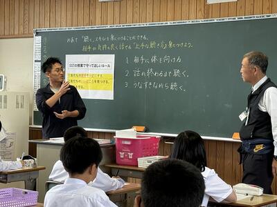 3年生では、都城コア学園と都城地域包括支援センター、社会福祉協議会から講師を多数お招きして「認知症サポーター養成講座」を行いました。認知症について正しく理解をして温かい目で見守ることが大切だと資料や映像を使って説明されました。認知症の方への接し方を考えたり、心に響く動画を見たりしてとても内容の濃い講座でした。2年生では、商工会議所を通して高濱様を派遣していただき、職場体験に向けての礼法指導をしていただきました。礼や挨拶の仕方だけでなく、靴の脱ぎ方なども教えていただき、大変勉強になりました。どちらの学年も、今日学んだことを日頃の対人関係に生かしていけるといいですね。