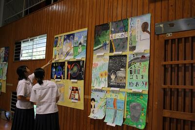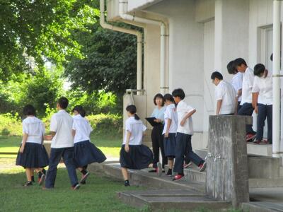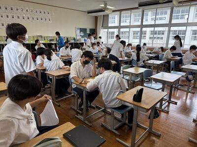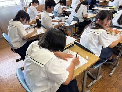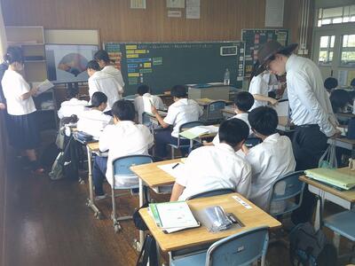 20日は参観日でした。学校運営協議会委員の方々もすべての授業を見て回りました。3年生では、自分が作成した漢文を級友に贈り、贈られた相手は感想を述べていました。また、合唱コンクールに向けてパート練習や全員での合わせを見ることができました。2年生は暑い中、2クラス合同で体ほぐしの運動を楽しそうに行っていました。1年生は、社会の調べ学習をしたり、英語のゲームを楽しんでしたりする様子が見られました。保護者の皆様、暑い中の参観、ありがとうございました。
