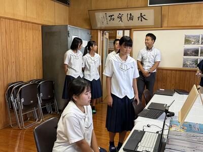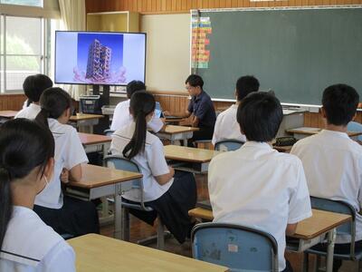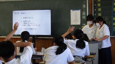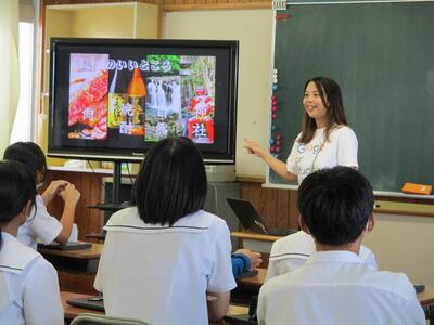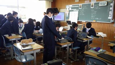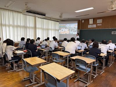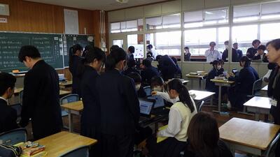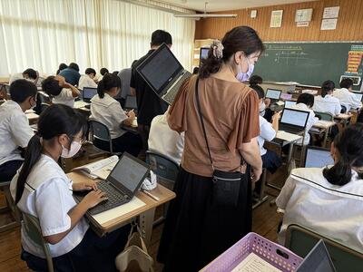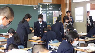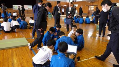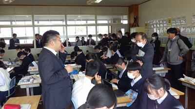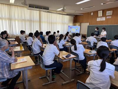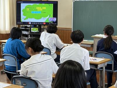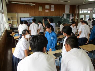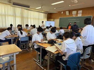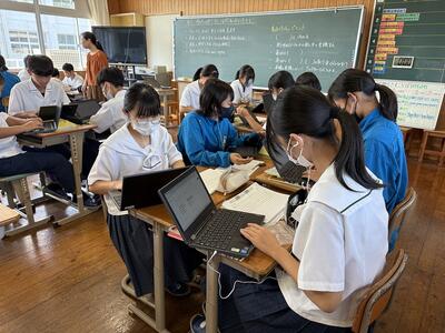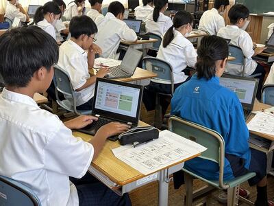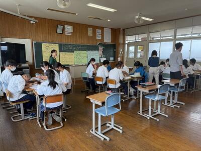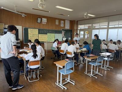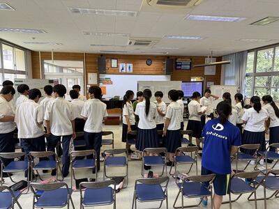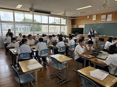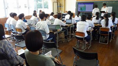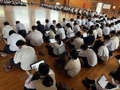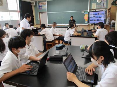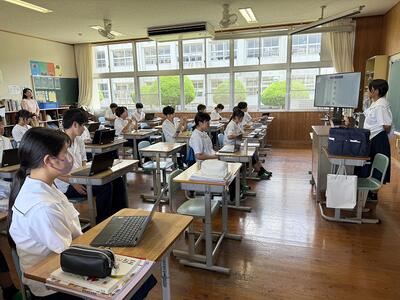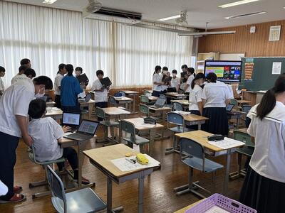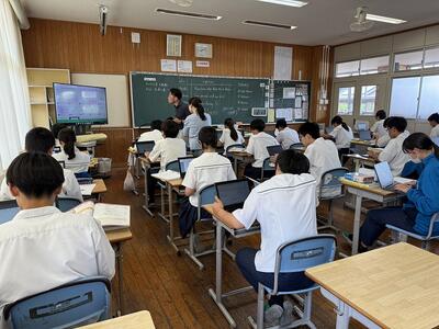 リーディングDXアドバイザーの南九州大学の准教授をお招きし、研究授業を4つ行いました。英語では、都城駅で出会った外国人に道を聞かれた時の会話を録画して意見交換をしていました。数学では、グラフから式を求めるのにどうしたらよいか、FigJamというアプリを使って意見交換をしていました。社会では、東海の産業について調べ、キャッチコピーを作成して意見交換をしていました。体育では、ラリーを続けるためにはどうしたらよいか話合い、ゲームで実践していました。どの授業でもICTを使って意見交換が行われ、生徒主体の時間が多く設けられていました。アドバイザーや教育委員会の方から多くの助言をいただきました。ありがとうございました。