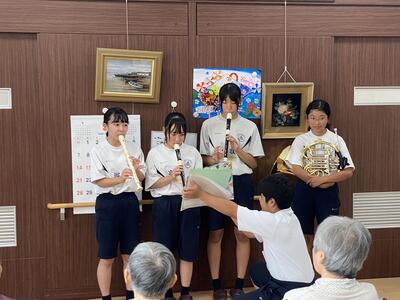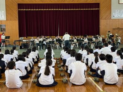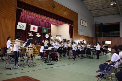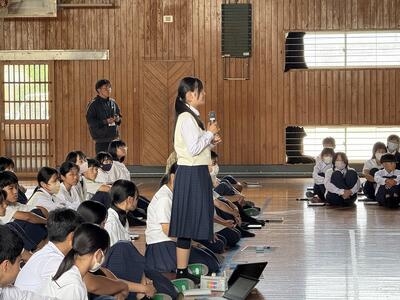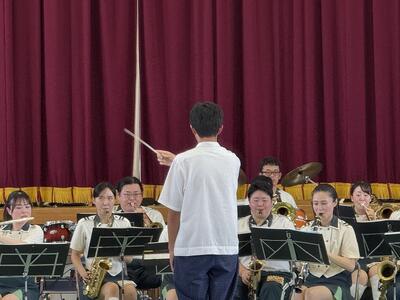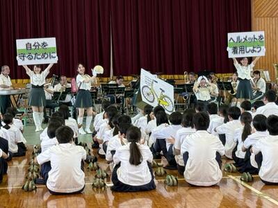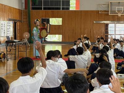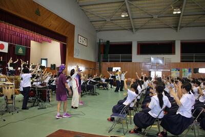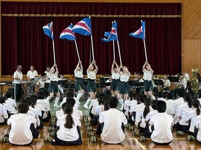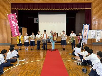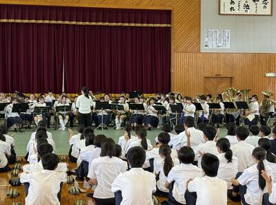 宮崎県警察音楽隊による鑑賞教室が行われました。名探偵コナンやスタジオジブリメドレーなど親しみやすい曲や、カーペンターズの美しい曲など様々な曲を演奏してくださいました。指揮者体験コーナーでは2名の生徒が2拍子と4拍子の指揮をして、その指揮に合わせて演奏してくれました。カラーガード等の巧みな演技の中に生徒が気を付けるべき交通ルールなども盛り込まれて中身の濃い時間があっという間に過ぎてしまいました。最後に、志和池中吹奏楽部も入って合同演奏を2曲披露してくれました。人数が増えて、迫力のある演奏になり、大変盛り上がりました。警察音楽隊の皆様、暑い中、生徒を楽しませていただき、ありがとうございました。