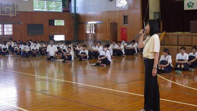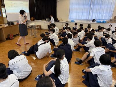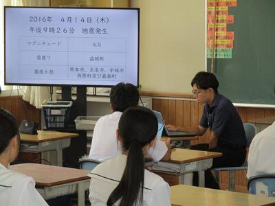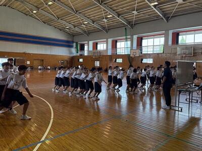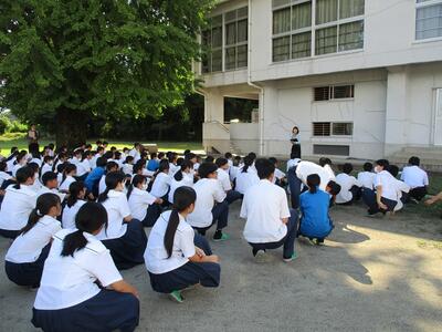 地震の避難訓練が行われました。初めに、2016年の熊本地震発生時、熊本に住んでいた先生からその時の体験や学んだこと、感じたことについて話がありました。当時の食事の事情や外国の人への通訳など被災地での心温まる話から、避難経路を複数確認することや靴を寝る場所に置いておくことなどすぐに実行できそうなアドバイスまで様々なことを話されました。その後、体育館や特別教室など6校時の授業場所からの避難を行いました。短い時間でしたが中身の濃い避難訓練を行うことができました。