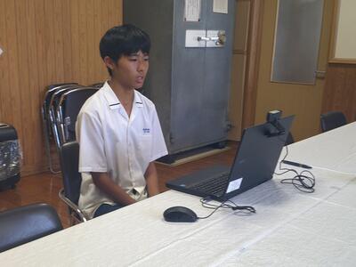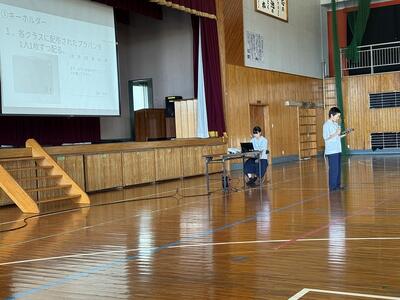 始業式に続き、オンラインで生徒会集会が行われました。各委員会の取組について、生徒が作成したスライドを使って分かりやすく説明をしていました。また、夏休みに何度も集まって検討していた傘の再利用の取組について説明がありました。生徒総会で全校で話し合ったことがプラバンのネームプレートに続き実現していきそうです。