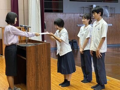1学期の終業式が行われました。熱中症対策から、校長室からのリモートで行いました。初めに、相撲と吹奏楽の表彰を行った後、いのちの大切さを考える内容の文を放送委員が読み上げました。各学年の代表が、給食時間での役割や声掛けによって自分や周りが成長したこと、勉強の質や授業スタイルが変化したこと、体育大会での副団長として困難を乗り越えたことなどを発表してくれました。明日から三者面談が始まりますが、それぞれ1学期を振り返って、充実した夏休みに繋げていけるといいですね。