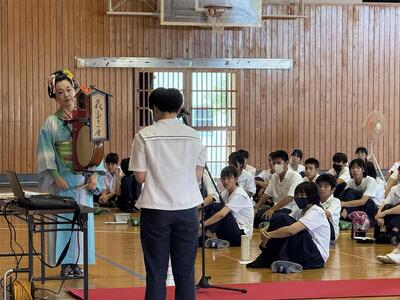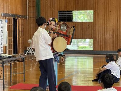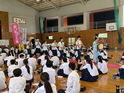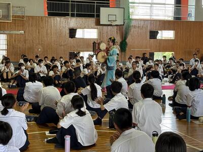 宮崎花ふぶき一座 座長 宮田わかな様を講師にお迎えして学校保健委員会を行いました。「まちに笑顔の花が咲く」をテーマに、チンドンの歴史から、チンドンを通しての人との出会いや夢まで様々な内容が盛り込まれた講演でした。さらに、吹奏楽部の有志による演奏と希望者による旗もちを加えてのチンドン行列も行われ、楽しい時間があっという間に過ぎてしまいました。生徒の感想を見ると、「人に求めるより与える人になれ」という言葉が特に心に残ったようです。宮田様、楽しく前向きな気持ちになる講演をありがとうございました。