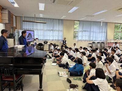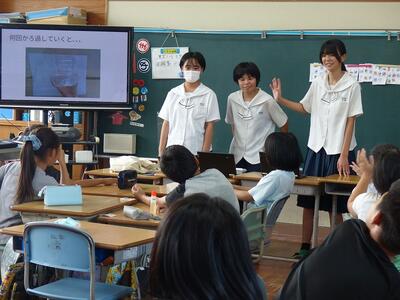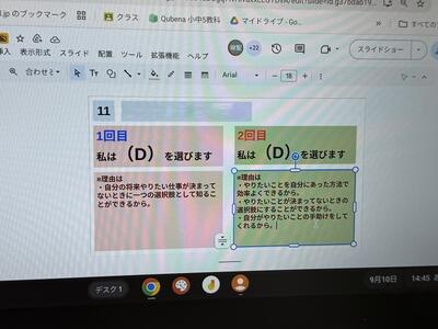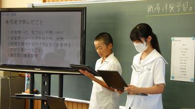 2年生の総合で、6月に行われた職場体験学習の発表を行いました。2日間の体験で行ったことや、インタビューをして学んだことなど充実した内容の発表でした。さらに、先日のジュニアICTリーダー養成講座で学んだことを生かして、文字やイラストなど見やすい画面にしたり、クイズを取り入れて興味を引いたりしていました。貴重な体験をさせてくださった事業所の皆様、本当にありがとうございました。