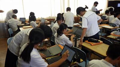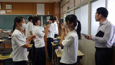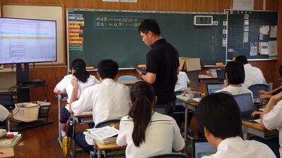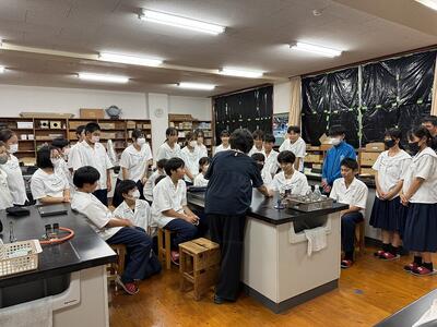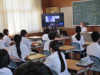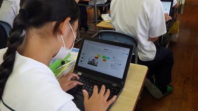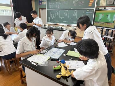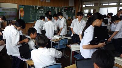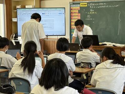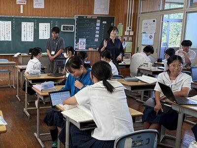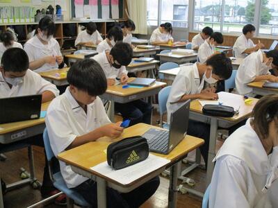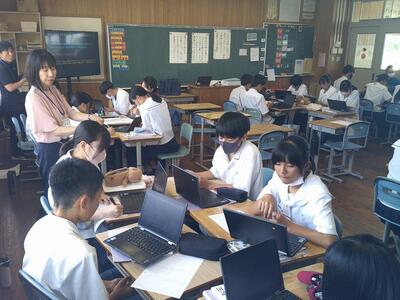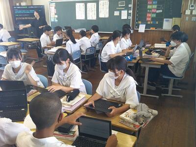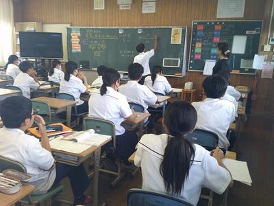志和池中では、生徒を主役とした授業から深い学びにつながるような取組を全職員で行っていく予定です。7月4日には、リーディングDXアドバイザーである南九州大学の渡邉准教授をお招きして、4教科の授業を見ていただきました。今回は、授業時間の半分以上を生徒主体にすることと、振り返りをすることの2点を意識した授業を行いました。生徒たちは、他の人に教えてもらったり教科書を調べたりして一生懸命に取り組んでいました。まだまだ課題は多いですが、生徒たちの深い学びにつながるよう、今後も授業改善をしていきます。
