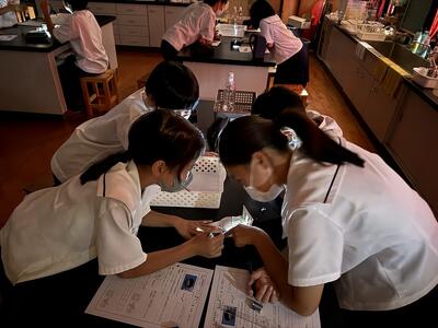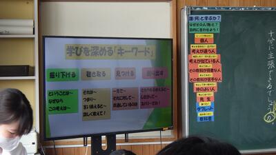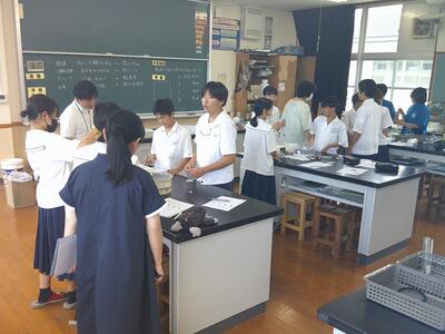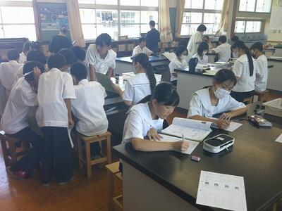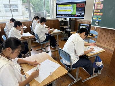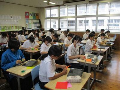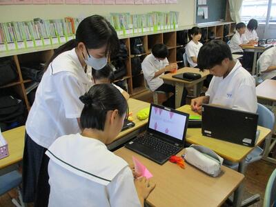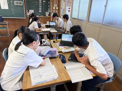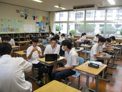 英語と理科の研究授業が行われました。英語では自分が書いたイチオシのご当地グルメを紹介する文を作成して、他の人と発表しあい、より良い文を作り上げていました。その後、スライドに紹介文や画像などを載せ、記事を作っていました。理科では、中和を学習した後、水酸化ナトリウムに塩酸を入れていくときのイオンの様子を、モデルなどを使って議論したり一人で学習を進めたりしていました。生徒が主役となり深い学びにつながる授業づくりを今後も研究していきます。
