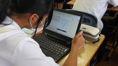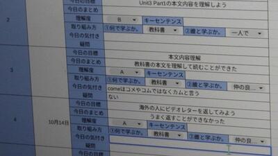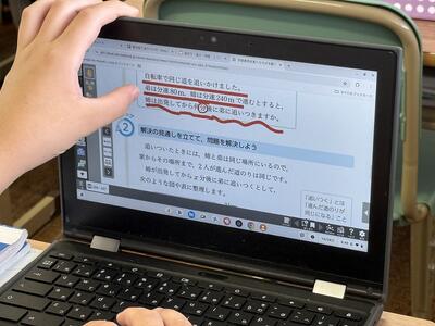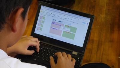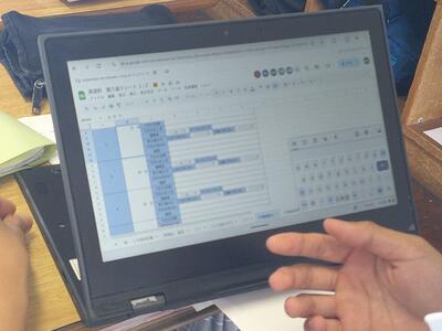 先週から今週にかけて、数学、国語、英語、理科の研究授業が行われました。数学では、生徒が自分でデジタル教科書に線を引いたり、スライドで他者参照をしたりしながら、式を立てて問題を解いていました。国語では、説明的文章において検証を追加した理由をグループや個人で根拠を探して考えをまとめていました。英語では、自分が好きなものを紹介する文章を考え、ビデオレターの動画を撮影していました。理科では、作用・反作用について様々な実験で検証し、スプレッドシートに記入した考察を他者参照していました。先生方は、タブレットで学習の状況を見て、つまづいている生徒へ助言をしたり、一人で学習している人のサポートをしたりしていました。