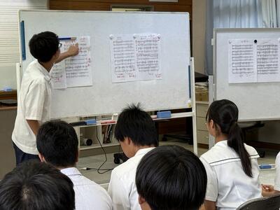 2年国語と3年音楽の研究授業が行われました。国語では、自分が選んだ短歌を調べて、他の短歌を選んだ人に短歌の作者や短歌に込められた思いを発表しました。スライドで分かりやすいように工夫して作成していました。音楽では、パートリーダーを中心にパートで話し合って練習をしていました。合唱では、代表が前で聴き、気づいたことをメンバーに伝えてよりよい合唱を作り上げようとしていました。また、職員研修では、研究授業を行ったり参観したりして気づいたことを班ごとに話し合って、今後の授業づくりに生かそうと意見を出し合いました。