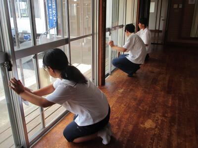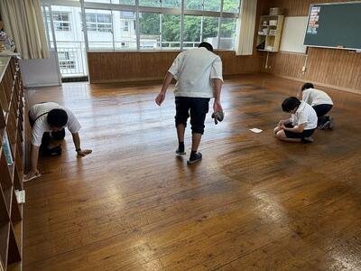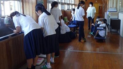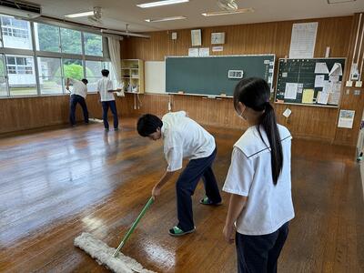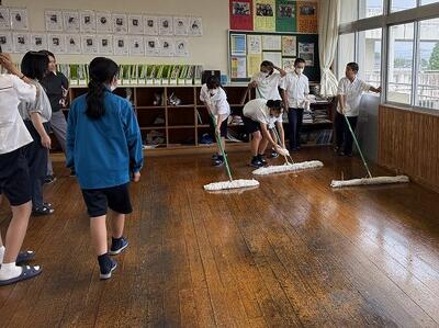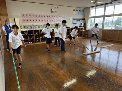 ワックス清掃が行われました。教室から机や椅子を全て出して通常の清掃を行った後、生活環境委員会が残ってワックスをかけてくれました。1年生は初めてのワックス清掃でしたが、先生に教えてもらいながら丁寧にワックスをかけていました。ピカピカになった床で、気持ちよく1学期を終えることができそうです。生活環境委員の皆さん、お疲れさまでした。