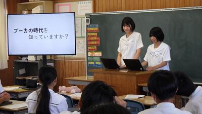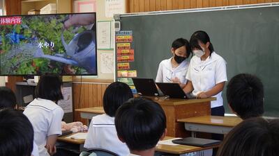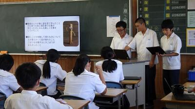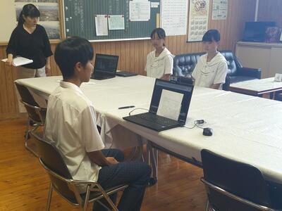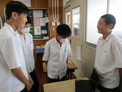 1年生の総合的な学習の時間に「志和池を知る」というテーマで調べたプレゼンの発表を行いました。写真やイラストを入れて分かりやすくしたスライドを表示しながら、興味をひくようクイズや寸劇を織り交ぜて発表していました。どの班も、小学校時のジュニアICTリーダー研修やプレゼンコンテストで培ったプレゼン力が十分に生かされた素晴らしい発表でした。発表後に参観した生徒からの評価やコメントを熱心に見ていました。次の発表に活かせるといいですね。