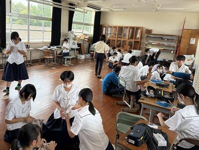 生徒総会で決定した、持ち主のいない放置傘の有効活用として、全校生徒で巾着づくりを行っています。その第一弾として、先日、3年生が昼休みに活動しました。生徒会役員に教わりながら、骨組みから外した傘の布を長方形に切り、かがり縫いや波縫いで丁寧に縫い合わせていきました。様々な模様の傘布を使って、個性あふれるおしゃれな巾着が完成しました。今後は2年生、1年生と順に活動を進め、9月17日までに全学年での完成を目指します。
