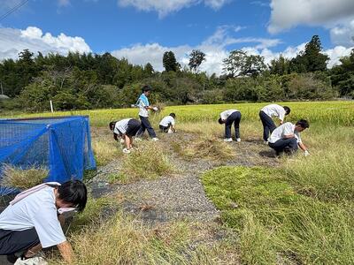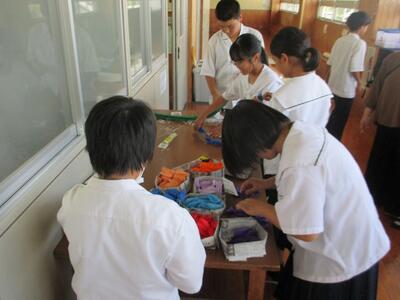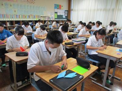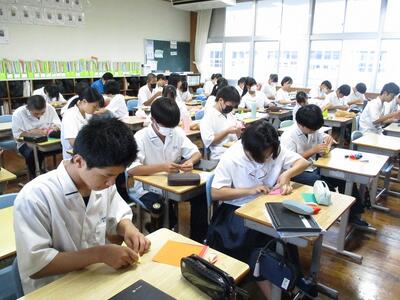 10月8日に志和池地区合同慰霊祭が行われます。慰霊祭で奉納する千羽鶴を4日に全校生徒で折りました。昨年、鶴をたくさん折った3年生は、てきぱきと鶴を折っていました。1・2年生はタブレットで折り方を確認しながら丁寧に折っていました。折った鶴を集めて、11日に1年生が糸通しをしてくれました。ビーズで留めたタコ糸に長い針を使って鶴を通す人、色の仕分けをする人、鶴の数を数えて足りない色を折る人と分担し協力して取り組んでいました。全校生徒の想いが織り込まれた千羽鶴の完成が楽しみです。
