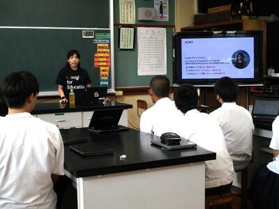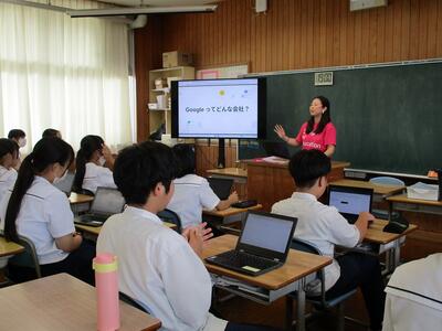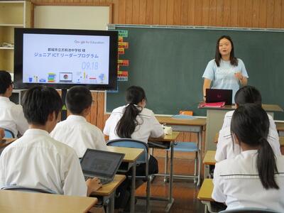 Google for Education の講師を4名お招きして、ジュニアICTリーダー養成プログラムが行われました。今回は2年生が対象で、クラスを2つに分けて4つの教室に講師の方々が入られて、プレゼンテーションの効果的な見せ方について様々な方法を教えていただきました。生徒たちは予め作成していた自己紹介と都城の良いところのプレゼン資料に、クイズを付け加えたり、印象に残りやすい文字に打ち換えたりして工夫していました。発表の声も、恥ずかしさを乗り越えて、抑揚をつけて発表していました。本日教わったことを、授業や総合の発表などでも生かしていけるといいですね。