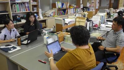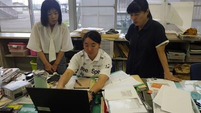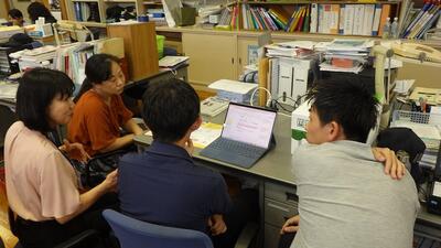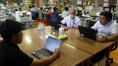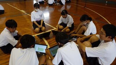 志和池中学校は、文部科学省のリーディングDX指定校に認定されており、4月から研修を積み重ね、授業改善に取り組んできました。授業改善は生徒にも伝わっており、「先生方の授業が変わった」と、終業式の1学期の振り返りで生徒が発表したほどです。24日の職員研修では、国社・数理・英・実技の4つの班に分かれ、25日に行われる研究授業の指導案を検討しました。ICTをどのような場面で効果的に使うことができるか、生徒主体の授業にするために時間配分をどのようにするかなど熱心に議論していました。研究授業で班ごとに全員で参観し、さらに改善していく予定です。