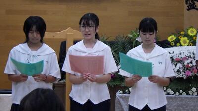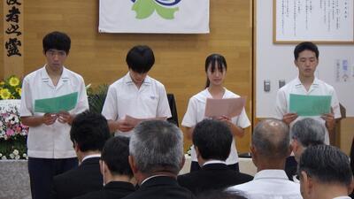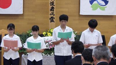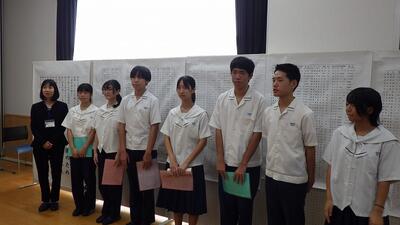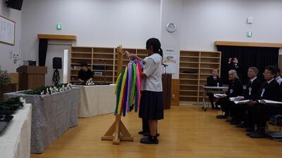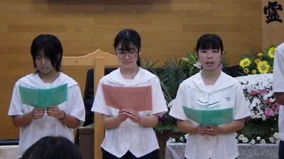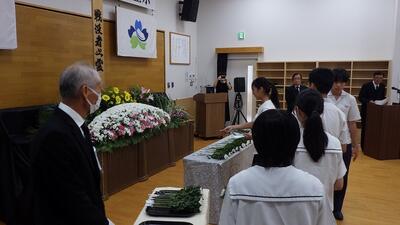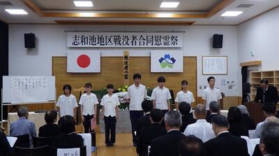 志和池地区戦没者合同慰霊祭が行われました。本校からは校長と3年生が7名出席しました。白い花を献花したあと全校生徒で折った千羽鶴を献納しました。その後、平和へのメッセージを7名の生徒が群読しました。慰霊祭が始まる前に多くの戦没者の名前を見て感じることがあったためか、一つ一つの言葉に想いが込められた発表になりました。参加していた地域の方からも、想いがひしひしと伝わってくる素晴らしい発表だったとお褒めの言葉をいただきました。10日の学習発表会でも群読を披露する予定です。