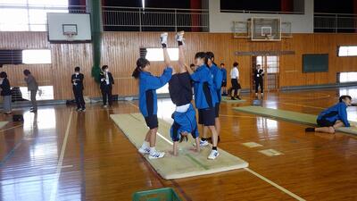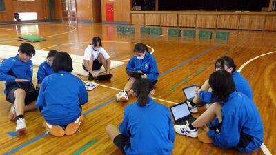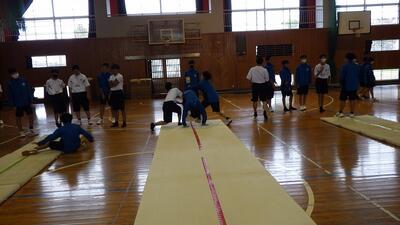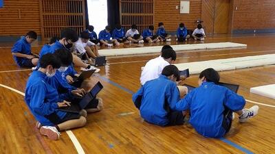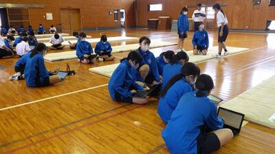1年生の保体の授業で、マット運動をしました。班で協力して、けがをしないように補助をしたり、できない技ができるようになるために一緒に練習の仕方を考えたりしていました。その後に行った中間発表は動画に撮って共有し、タブレットで感想やアドバイスを記入していました。今後の技の上達が楽しみですね。