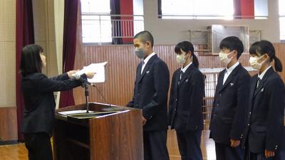 中体連秋季体育大会の県大会と、地区駅伝大会に出場する生徒の壮行会が行われました。初めに、地区大会などの各種大会の表彰式を行いました。大きな声で返事をしていて、誇りに満ち溢れていました。続いて、陸上部・サッカー部・野球部・バドミントン・地区駅伝の順に抱負を述べました。機敏な行動としっかりとした抱負の発表で、大会への意気込みを感じました。駅伝大会が21日、野球とサッカー、テニスが26日、陸上とバドミントンが11月2・3日に行われます。選手の皆さん、頑張ってください。