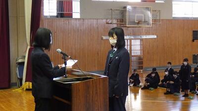 全校集会が行われました。初めに、県中体連テニス女子シングルス優勝、野球・陸上の大会の表彰が行われました。また、市内の小5~中3で行われた算数の問題のQ-1グランプリ上位20学級に贈られるQ1マスターになった3学級の表彰や体力テストA判定の表彰も行われました。その後、先日のリーディングDX公開授業のアンケートの意見をもとに、生徒たちが頑張っている姿が素晴らしかったこと、新しい志和池中の学びのブランドを高めていって欲しいと校長先生から話がありました。生徒指導・校時程変更の話、バイオリン演奏と盛りだくさんの全校集会で、新たな挑戦につながる充実した一週間を締めくくることができました。