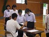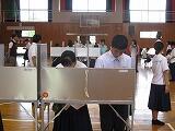 今日の6校時は避難訓練がありました。地震を想定した訓練で、当初はグラウンドの予定でしたが、雨のため体育館に避難しました。校長先生の話の後、防災に対する映像を視聴しました。最後に、防災担当の村尻先生が出題されたイエスノー形式の防災クイズを全校生徒で考えました。楽しみながらも真剣な避難訓練となりました。1学期は授業中に地震があり、机の下に身を隠すこともありました。日頃から防災意識をもって生活したいですね!