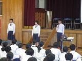 9月26日(木)、2・3年生を対象に青年劇場の方々による鑑賞教室ワークショップが行われました。5校時は2・3年生全員が参加し、劇団員の方々と身体を使ったレクリエーションをしたり、四季を言葉なしにジェスチャーで伝えたりしました。6校時は2・3年生の代表者に劇の演じ方を実際に伝授していただきました。本校は10月13日(日)に文化祭が行われます。学んだことを劇で生かせたらいいですね!