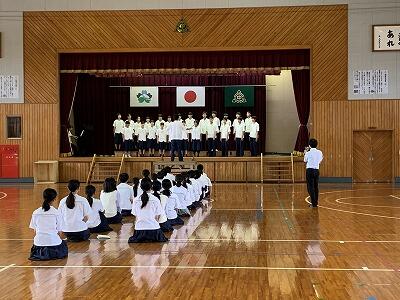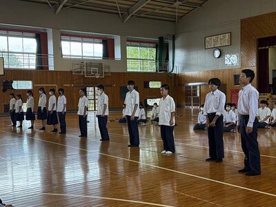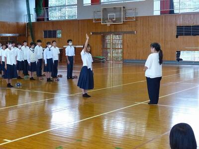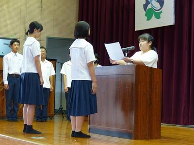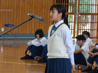 中体連秋季大会の県大会と、地区駅伝大会の選手壮行会が行われました。初めに、地区大会等の表彰を行った後、陸上、女子ソフトテニス、バドミントン、テニス、駅伝の順に前に出て抱負を述べました。生徒会役員から激励の言葉をいただいた後、ソフトテニス部がマイクを使わずに大きな声で堂々と選手宣誓をしました。それぞれ力を発揮し、悔いのない大会になるといいですね。