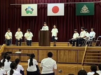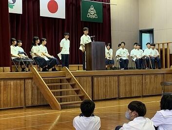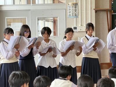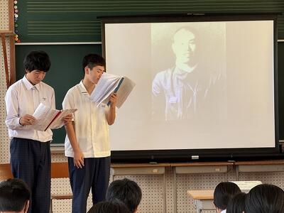2年の学活で、平和についての朗読劇が行われました。修学旅行前の平和学習の一環として1学期から希望者を募って練習してきた成果の発表でした。抑揚があり、迫力のある声や低く抑えた声など多彩な読み方で、聴いている人に心情や情景が伝わってくる素晴らしい発表でした。修学旅行先で実物を見たときに、朗読劇を思い出すのではないでしょうか。