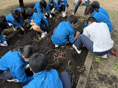 5月に植えたサツマイモの収穫をしました。夏の間、青々と生い茂った葉でつくられた養分が蓄えられて、大小さまざまな芋ができていました。芋は生徒が持ち帰るだけでなく、土づくりでお世話になった地域の方にも差し上げました。1組と2組の隣接した花壇であるのに、芋の大きさや数が異なっていたので、なぜそのようになったのか考えると面白いですね。