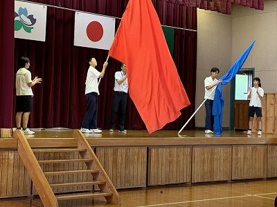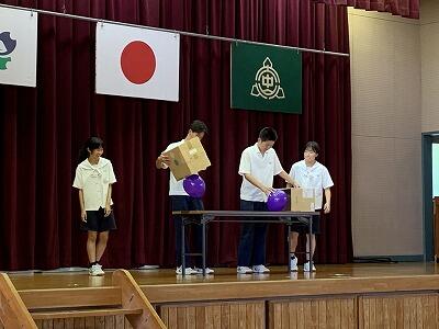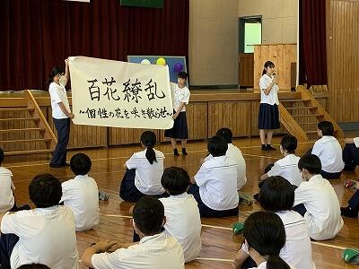 22日は終業の日でした。熱中症対策のため終業式はリモート形式で行いましたが、結団式は初めて団の顔合わせをすることもあり、体育館で短縮して行いました。体育大会実行委員がスローガン「百花繚乱」の紹介をした後、団色決定をしました。団長・副団長がバレーボールなどのボールを投げて風船を割るゲームは実況中継付きで大変盛り上がりました。夏休み後すぐの体育大会に向けて、実行委員、団長・副団長・リーダーの皆さん、それぞれ頑張ってください。