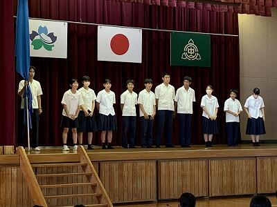 14日から始まる県総合体育大会と吹奏楽コンクールの壮行会が行われました。暑い中、県大会出場者も激励者もしっかりとした姿勢で臨みました。各部の代表者がそれぞれ目標を言った後、生徒会代表が「自分に誇りをもって頑張ってきてください」と激励の言葉を述べました。陸上部代表の生徒が選手宣誓をしたのち、全員で校歌を大きな声で斉唱しました。志和池の、都城地区の代表としての緊張感も楽しんで、それぞれの力を発揮してくれるといいですね。