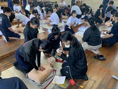 救命救急法の研修を、都城消防局から2名の講師に来ていただき実施しました。先生方と、全ての部活動の代表も参加して、胸骨圧迫とAEDによる心肺蘇生を体験しました。AEDの装着など、毎年研修を行いますが、今回はAEDの鞄内に収納されている道具の意味と使い方も教えていただき、人の命とプライバシーを守るための様々な工夫がなされていることを学ぶことができました。消防局の講師の皆様、ありがとうございました。