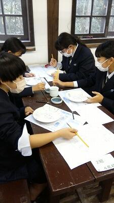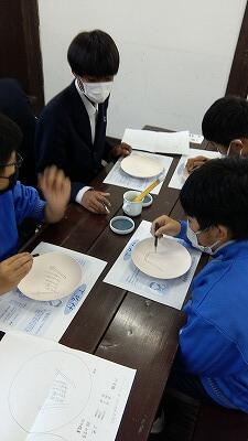 陶芸はちょっと時間が足りないので、ここではお皿に絵や字をかいていきます。
