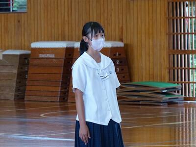 中体連秋季大会の県大会と、地区駅伝大会の選手壮行会が行われました。初めに、地区大会等の表彰を行った後、陸上、女子ソフトテニス、バドミントン、テニス、駅伝の順に前に出て抱負を述べました。生徒会役員から激励の言葉をいただいた後、ソフトテニス部がマイクを使わずに大きな声で堂々と選手宣誓をしました。それぞれ力を発揮し、悔いのない大会になるといいですね。