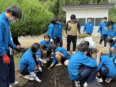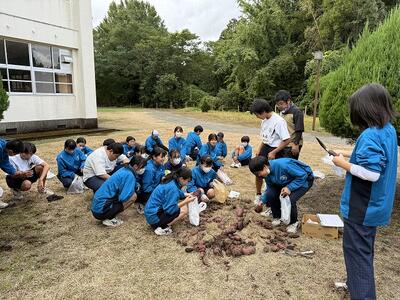 5月に植えたサツマイモの収穫をしました。夏の間、青々と生い茂った葉でつくられた養分が蓄えられて、大小さまざまな芋ができていました。芋は生徒が持ち帰るだけでなく、土づくりでお世話になった地域の方にも差し上げました。1組と2組の隣接した花壇であるのに、芋の大きさや数が異なっていたので、なぜそのようになったのか考えると面白いですね。