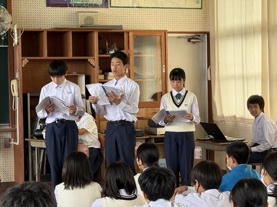 2年の学活で、平和についての朗読劇が行われました。修学旅行前の平和学習の一環として1学期から希望者を募って練習してきた成果の発表でした。抑揚があり、迫力のある声や低く抑えた声など多彩な読み方で、聴いている人に心情や情景が伝わってくる素晴らしい発表でした。修学旅行先で実物を見たときに、朗読劇を思い出すのではないでしょうか。