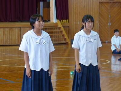 中体連秋季大会の県大会と、地区駅伝大会の選手壮行会が行われました。初めに、地区大会等の表彰を行った後、陸上、女子ソフトテニス、バドミントン、テニス、駅伝の順に前に出て抱負を述べました。生徒会役員から激励の言葉をいただいた後、ソフトテニス部がマイクを使わずに大きな声で堂々と選手宣誓をしました。それぞれ力を発揮し、悔いのない大会になるといいですね。
