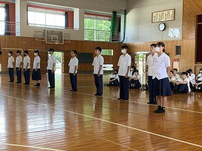 14日から始まる県総合体育大会と吹奏楽コンクールの壮行会が行われました。暑い中、県大会出場者も激励者もしっかりとした姿勢で臨みました。各部の代表者がそれぞれ目標を言った後、生徒会代表が「自分に誇りをもって頑張ってきてください」と激励の言葉を述べました。陸上部代表の生徒が選手宣誓をしたのち、全員で校歌を大きな声で斉唱しました。志和池の、都城地区の代表としての緊張感も楽しんで、それぞれの力を発揮してくれるといいですね。