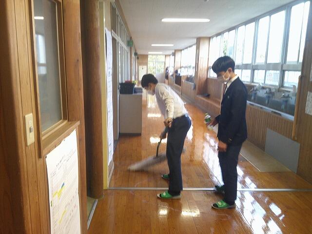 12月9日(金)駅伝ロードレース大会の午後、環境美化委員会が教室前の廊下のワックス清掃を行いました。午前中の疲れもなんのその、元気に廊下をふいてくれました。使った道具は、きれいに洗浄したのち、風通しのよい場所で干す作業まで、全員で協力して頑張りました。年に2回のワックス清掃のおかげで、志和池中の床はいつもピカピカです。