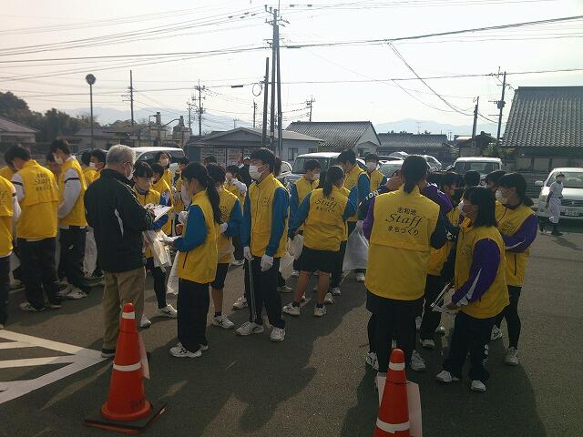 5キロのコースを1キロずつ分担して作業します。一番遠いのは野球部と陸上部で、歩いて楠牟禮橋まで