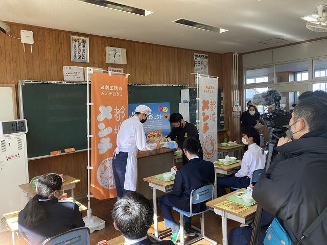 1月12日(木)「はばたけ都城六次産業化推進協議会」が主催する”「都城メンチ」で受験生を応援!」プロジェクトが本校の3年生の教室で行われました。都城市の中3生を応援する取組で、市内の3年生に応援メンチ券を送る企画の一環として、本校の3年生がメンチカツを給食の時間にいただくというものでした。当日は、生産者の観音池ポークの馬場様をはじめ、新聞社やテレビ局の取材の方々が大勢来校され、子どもたちがメンチカツを食べる様子を写真や映像で撮影されました。食べ終わった生徒は、テレビ局の取材に対して、メンチカツの味を「外はサクサク、中はジューシー」と笑顔で答える場面も見られました。取材にこられた方々も、志和池中の生徒の気持ち良いあいさつと、礼儀正しい態度に感心されていました。また一つ、志和池ブランドが外の世界に発信された日になりました。