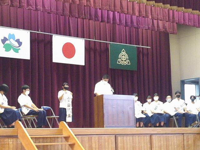 7月23日、24日に行われる、陸上の中体連県大会の選手壮行式がありました。ハードルや800m、砲丸投げで県大会に出場する選手たちは、それぞれの抱負を力強く述べ、最後に主将が選手を代表し「支えてくれた人たちへの感謝を忘れず、精一杯頑張ります」と力強く宣誓しました。3年生にとっては最後の県大会。自分のベストの力を出し切って欲しいです。